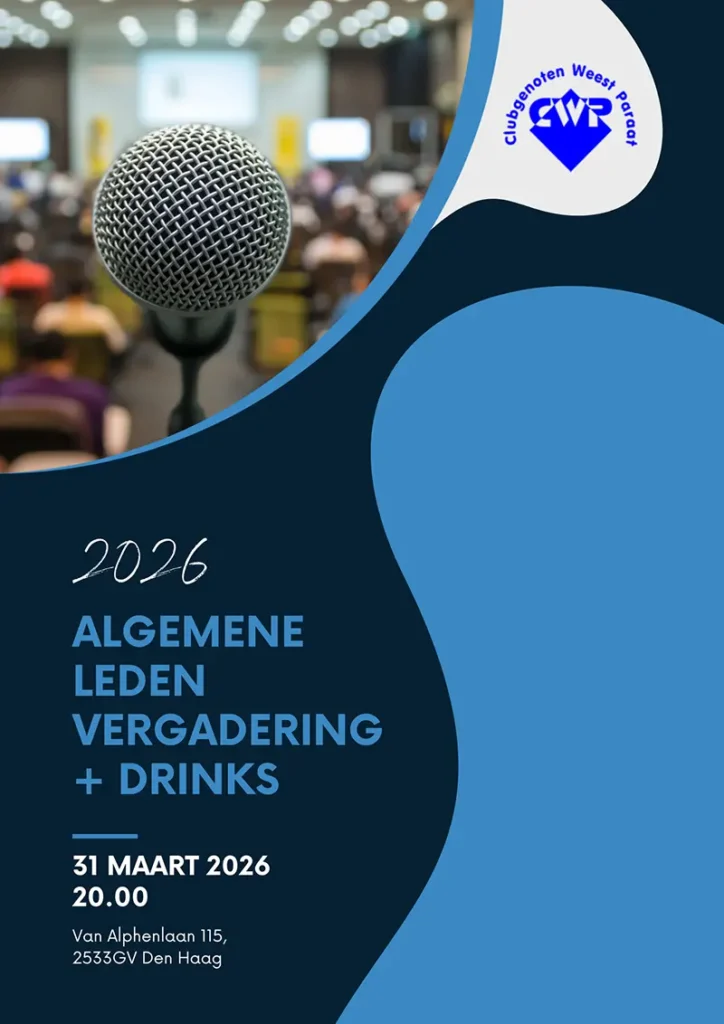 Op dinsdag 31 maart 2026 zijn alle leden van harte welkom om mee te praten, tijdens de Algemene Ledenvergadering van Clubgenoten Weest Paraat. De vergadering start om 20:00 uur in het clubgebouw aan de Van Alphenlaan.